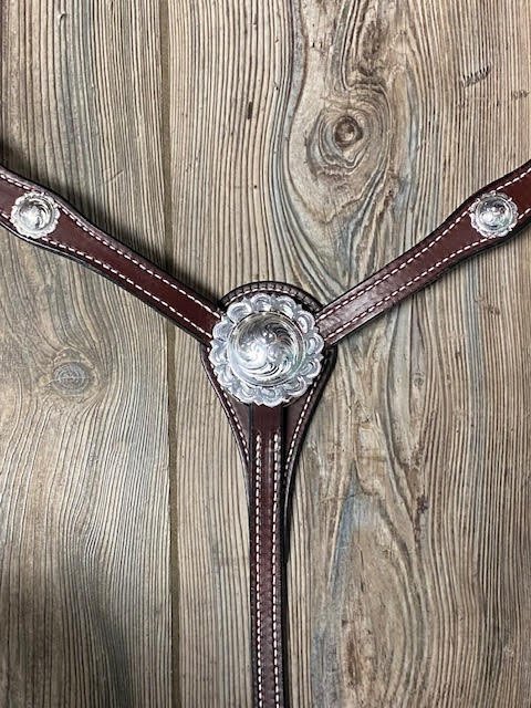 New Cowperson Tack Silver Concho Breastcollar. Dark oiled leather. Made in America.